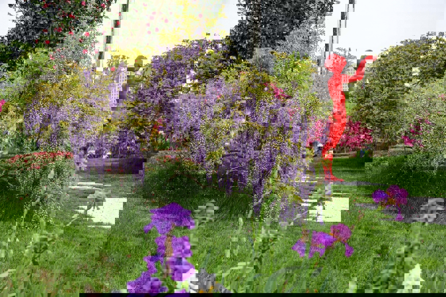 并吞派春色中,紫藤以垂婉之姿绘就别样烦扰。不同于杜鹃的强烈铺陈,串串花穗自枝端温文垂下,如流苏、如帘幕,在微风里摇曳生姿,尽显娴雅韵味。此外,本次展出的“长生”“信仰”等多属德国鸢尾品种也各具风仪,清蓝、深紫、紫褐等丰富颜色,为春日增添了更多线索。