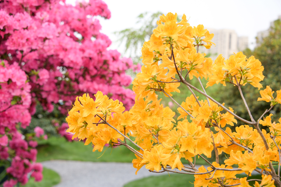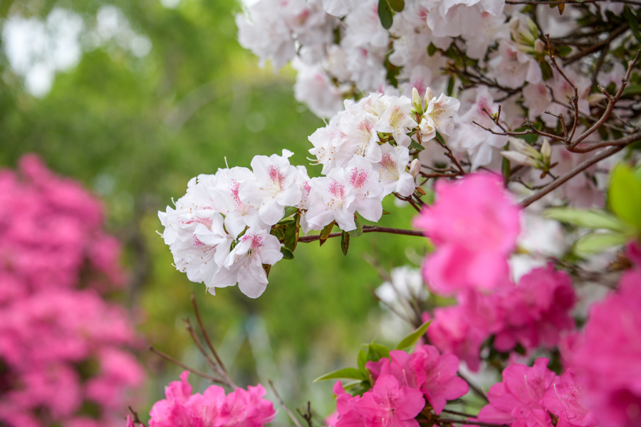 此前盛放的垂枝樱余韵仍在,杜鹃与紫藤已接棒成为春日主角。素有“花中西施”好意思誉的杜鹃是春日园林中当之无愧的C位,福州配资本次展览汇注大津杜鹃、雾岛杜鹃、锦绣杜鹃等公共数十个品种共三百余株,各色花团强烈怒放,将园林晕染得五彩缤纷。